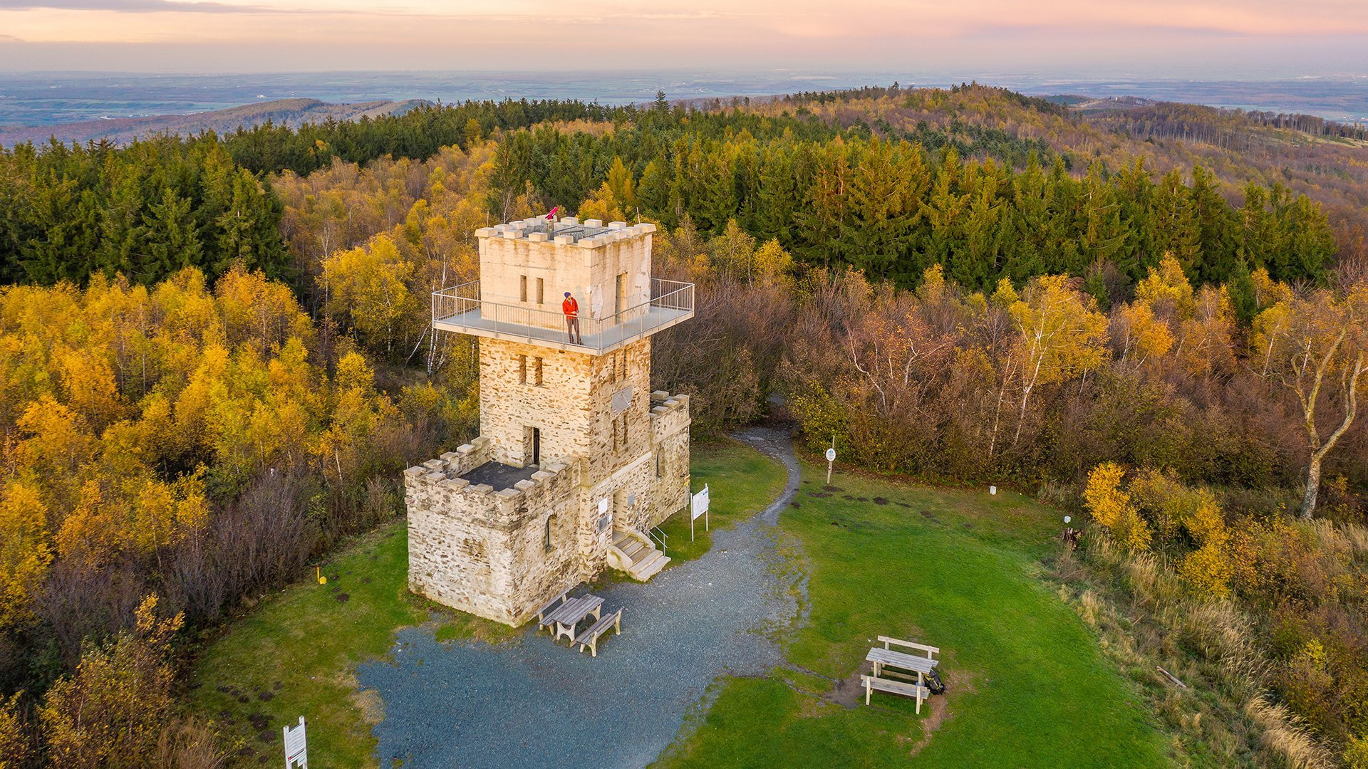 Bild: Aussichtsturm auf dem Gipfel des Írottkő. Erbaut 1913 in Ungarn. Seit 1922 markiert der Turm die Grenze nach Trianon, von 1946 bis 1990 verlief hier der Eiserner Vorhang.