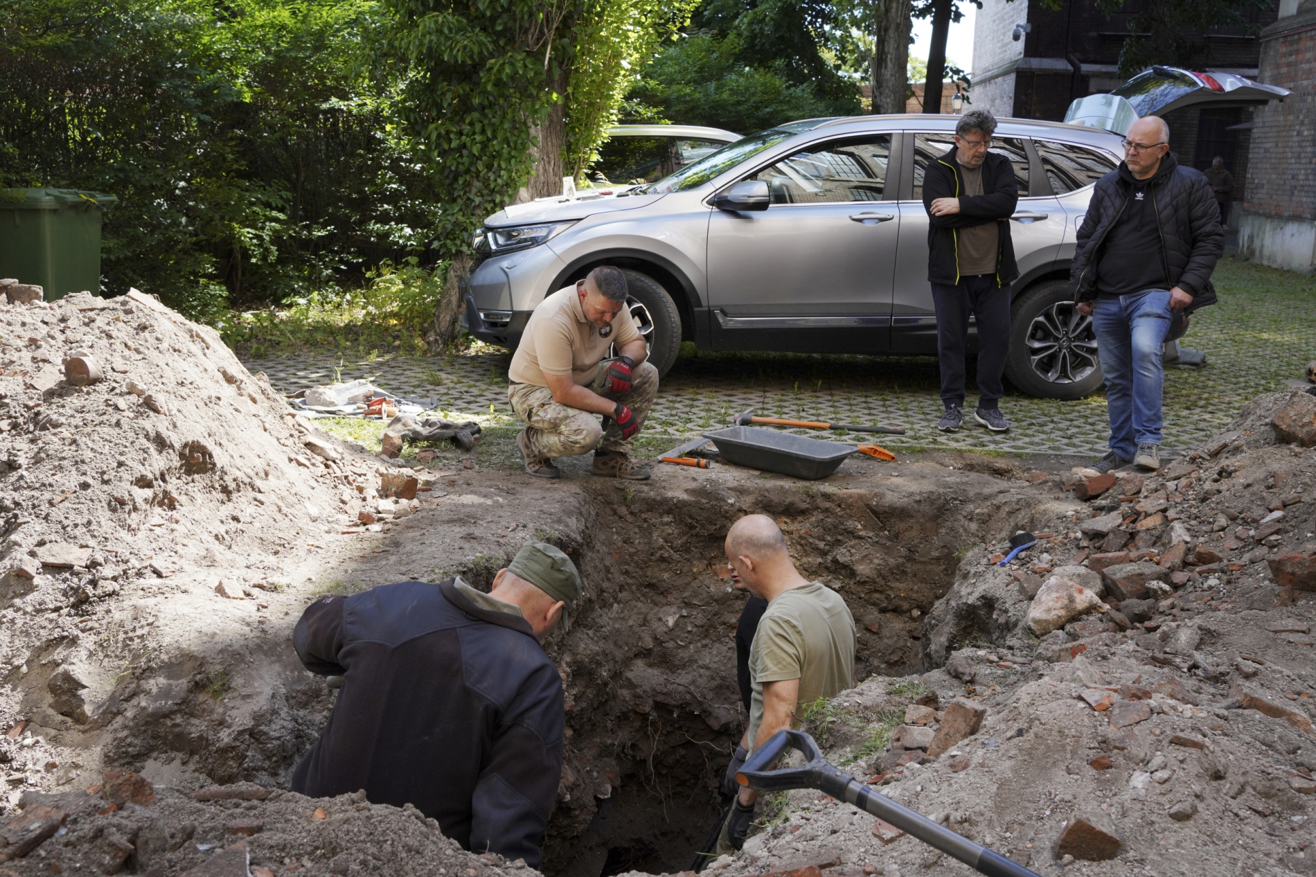 Die Ausgrabungsarbeiten begannen nach einer vorbereitenden Begehung am 25. Mai 2025, und die Überreste des ersten verstorbenen Soldaten wurden bald gefunden. In der Folge wurden dreizehn weitere Soldaten aus dem ehemaligen Granatenkrater geborgen, und bei der Exhumierung wurden auch sieben Personen identifiziert, so dass die Angehörigen von sieben Familien nun endlich erfahren können, wo ihr in den Kämpfen gefallener Vorfahre beerdigt wurde. Eine Reihe von persönlichen Gegenständen wie Uhren, Kämme, Rasierapparate, medizinische Geräte und Metallmünzen aus dieser Zeit wurden geborgen. Auch Reste des Turms des Nationalarchivs, der im Sommer 1945 durch eine Detonation abgerissen wurde, wurden gefunden. Die Arbeiten werden nach Pfingsten auf dem noch zu bearbeitenden Gelände fortgesetzt.