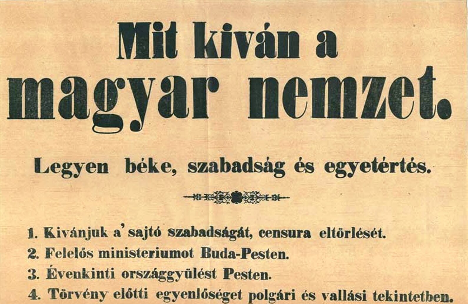Die ungarische Revolution begann am 15. März 1848 in Pest und Buda, als eine Massendemonstration von Studenten, Bürgern und Handwerkern. Die Anführer – die Dichter Sándor Petőfi, Mór Jókai, Pál Vasvári und andere junge Aufständische fassten ihre Forderungen für einen demokratischen Rechtsstaat in 12 Punkten zusammen.